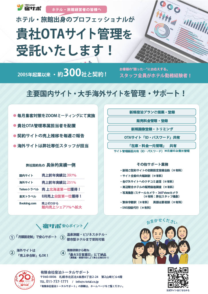 起業21年目を迎えて、全国のホテル、旅館様へのOTA管理サポートの重要性を、ますます感じる昨今です。