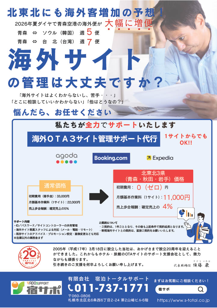 今回弊社では、2026年夏ダイヤから青森空港の海外便が増便することを踏まえて、海外サイトを強化したいが、管理画面が煩雑でわからない、日々の業務に追われて、なかなか管理できいないとのお声にお応えすべく、北東北3県限定での海外サイト強化キャンペーンをスタート!